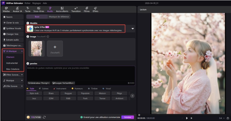 - de définir les paroles, le style et la durée (jusqu’à environ 3 minutes)