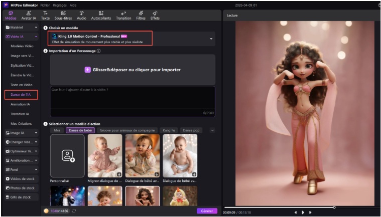 L’intégration de Kling 3.0 Motion Control permet un contrôle avancé des mouvements et expressions :