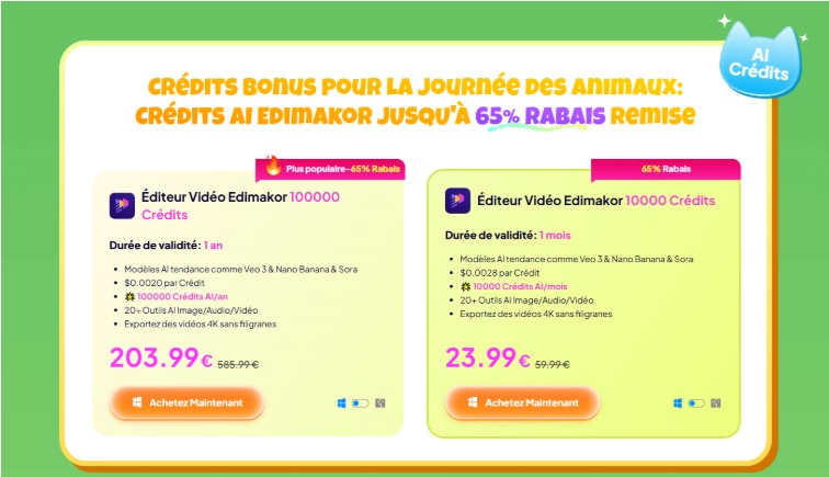 Offre promotionnelle : À l’occasion du lancement de la version 4.8.0, HitPaw propose une campagne promotionnelle : jusqu’à 65 % de réduction, bonus de 50 crédits par jour pour les publications avec le hashtag #EdimakorPetDay.